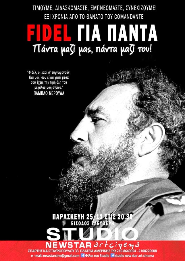Ο Ελληνοκουβανικός Σύνδεσμος σας προσκαλεί στην εκδήλωση που διοργανώνει η New Star για τα 6 χρόνια από το θάνατο του Φιδέλ Κάστρο, την Παρασκευή, 25 Νοέμβρη, στις 8.30 το βράδυ στον κινηματογράφο STUDIO, Σταυροπούλου 33 & Σπάρτης, Πλατεία Αμερικής.