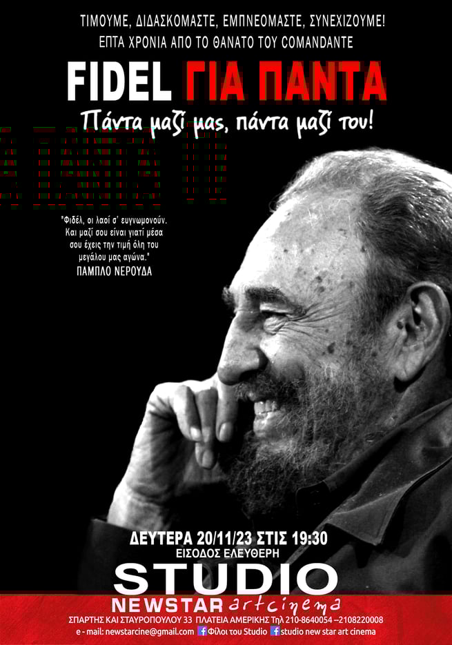 Ο Ελληνοκουβανικός Σύνδεσμος σας προσκαλεί στην εκδήλωση που διοργανώνει η New Star για τα 7 χρόνια από το θάνατο του Κομαντάντε Φιδέλ Αλεχάντρο Κάστρο Ρους, την Δευτέρα 20 Νοεμβρίου του 2023 στον κινηματογράφο Studio New Star Art στις 19:30 μ.μ., Σταυροπούλου 33 & Σπάρτης, Πλατεία Αμερικής.
